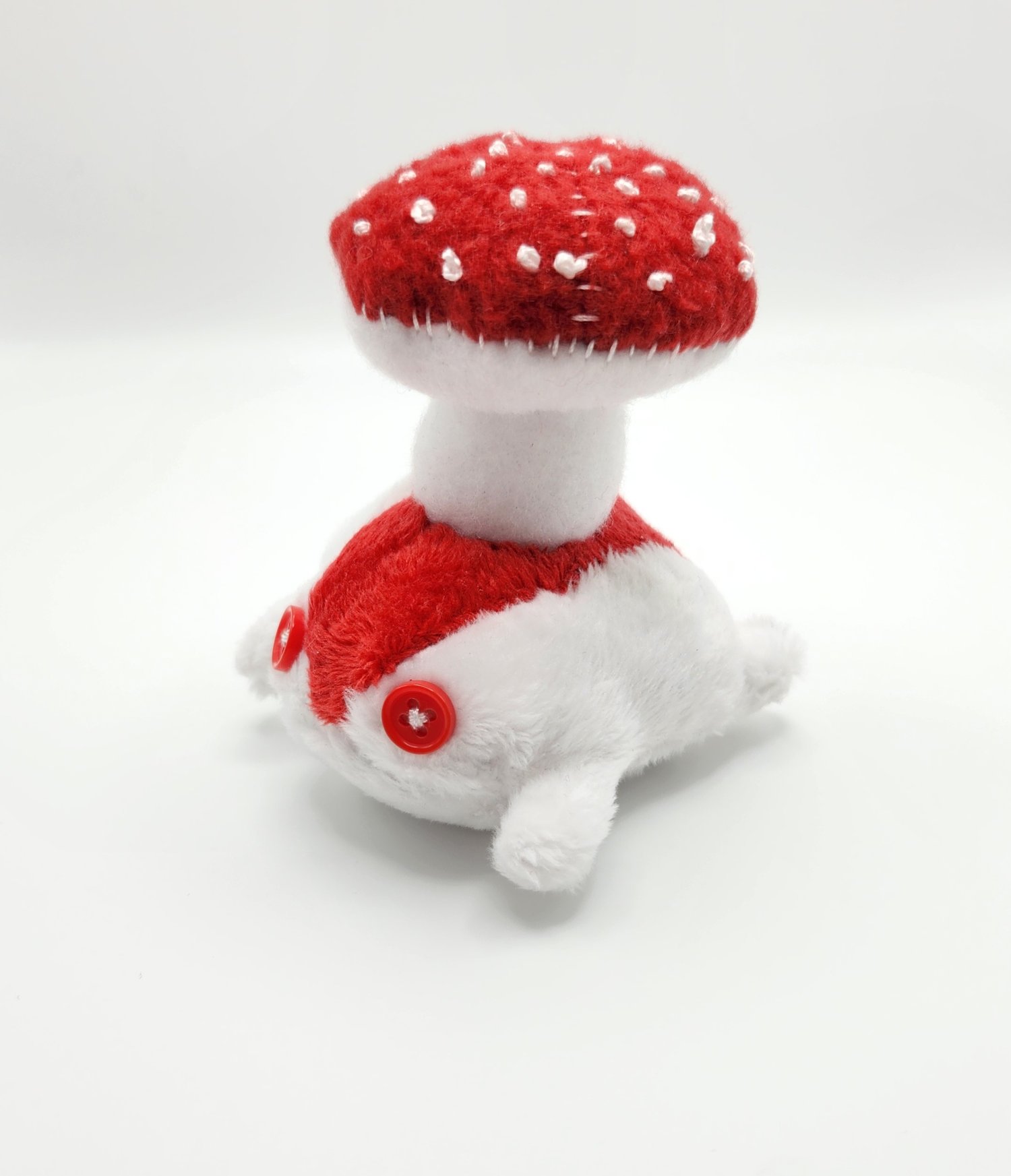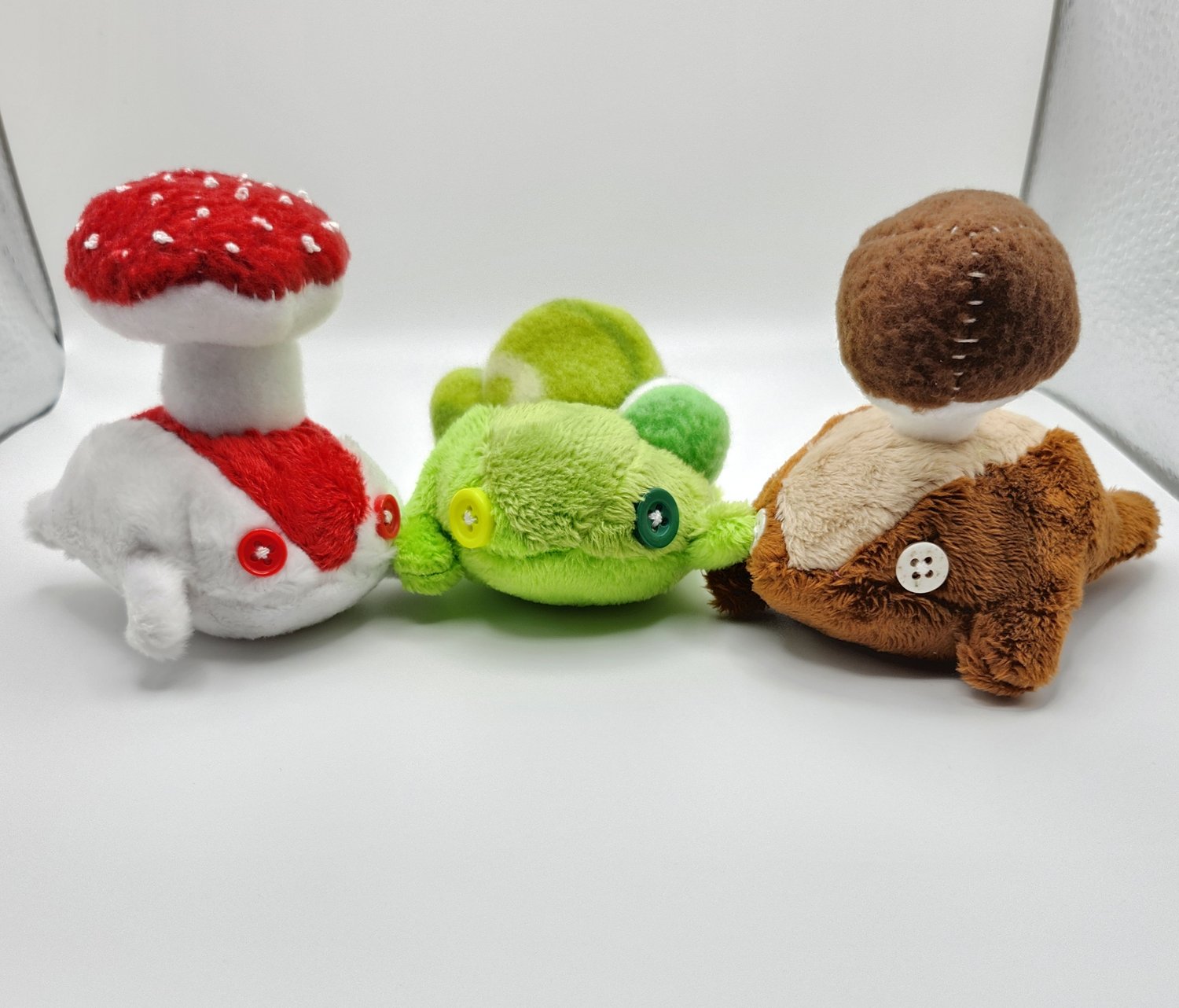 It's sprog time! These little mushroom frogs aka sporgs are small and ready to find their forever homes. The bodies are made from minky scrap pieces, stuffed with fabric scraps, and have button eyes. The mushrooms on their backs are hand stitched from fleece scraps. One mushroom has embroidered white spots. They are palm-size cuties.
