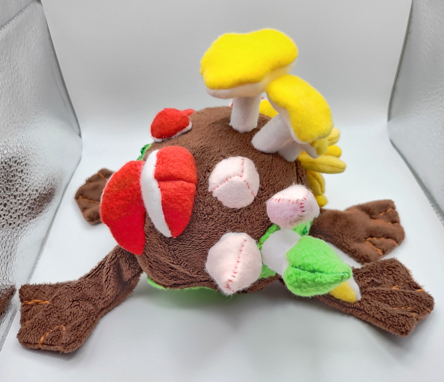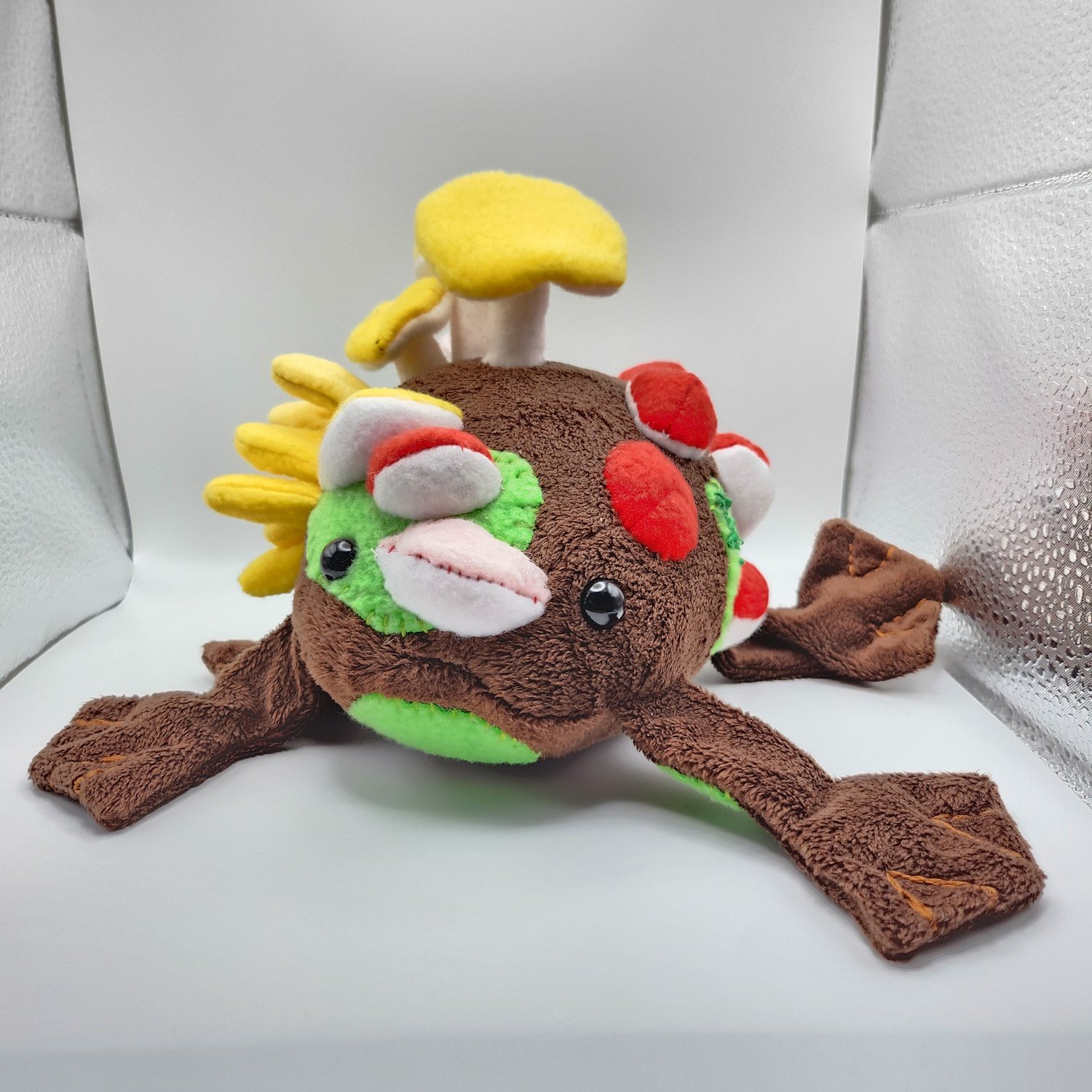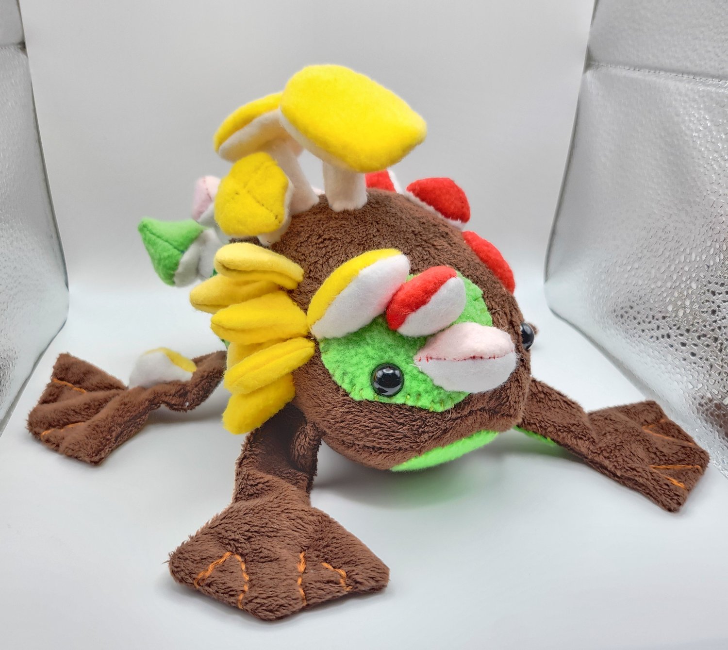 This bean frog is made to resemble a piece of wood being overtaken by mushrooms and moss on the forest floor. The body is made from minky fabric and stuffed with poly fil. They're limbs are weighted with beads. The mushrooms are handstitched and made from fleece scraps and stuffed with fabric scraps. The moss is a combination of fleece and embroidery floss. They're looking for a home where the can continue growing fungi in peace.