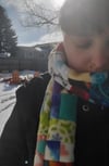 This scarf is made of scraps of fleece quilted together. The scarf is approximately 62 inches long. Several different types of fleece are pieced together. Some blocks are softer than others but the scarf as a whole is very warm. It is machine washable.