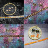 These spooky choker earring sets are the perfect addition to your spooky accessories collection. They are all made with printed cotton fabrics, jewelry pieces, ribbon clamps, and earrings. The Magic Dust set comes with a choker and matching earrings. The choker had a silver ornament on the front. The Ghost set comes with a choker and double bow earrings. The Skull set comes with a choker and matching earrings. The Jack-o-lantern choker set is made of ribbon and comes with a matching pair of ribbon bow earrings.