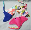 These new friends are stingrays eco-friendly made of fleece, printed flannel and cotton fabrics, doll safety eyes, buttons, and are stuffed with fabric scraps. The stingray with the pink top has printed cotton smiley face fabric. The multicolored stingray has printed flannel fabric. Last but not least, the patchwork ray has flannel fabric underneath. These plushies are 100% waste-free.