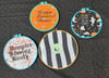 These decretive embroidery hoops are the perfect wall hanging to tie together your spooky summertime decorations. These items are made with second hand embroidery hoops, printed cotton fabric, and embroidery thread. The hoop with the skull is stitched with glow in the dark thread.